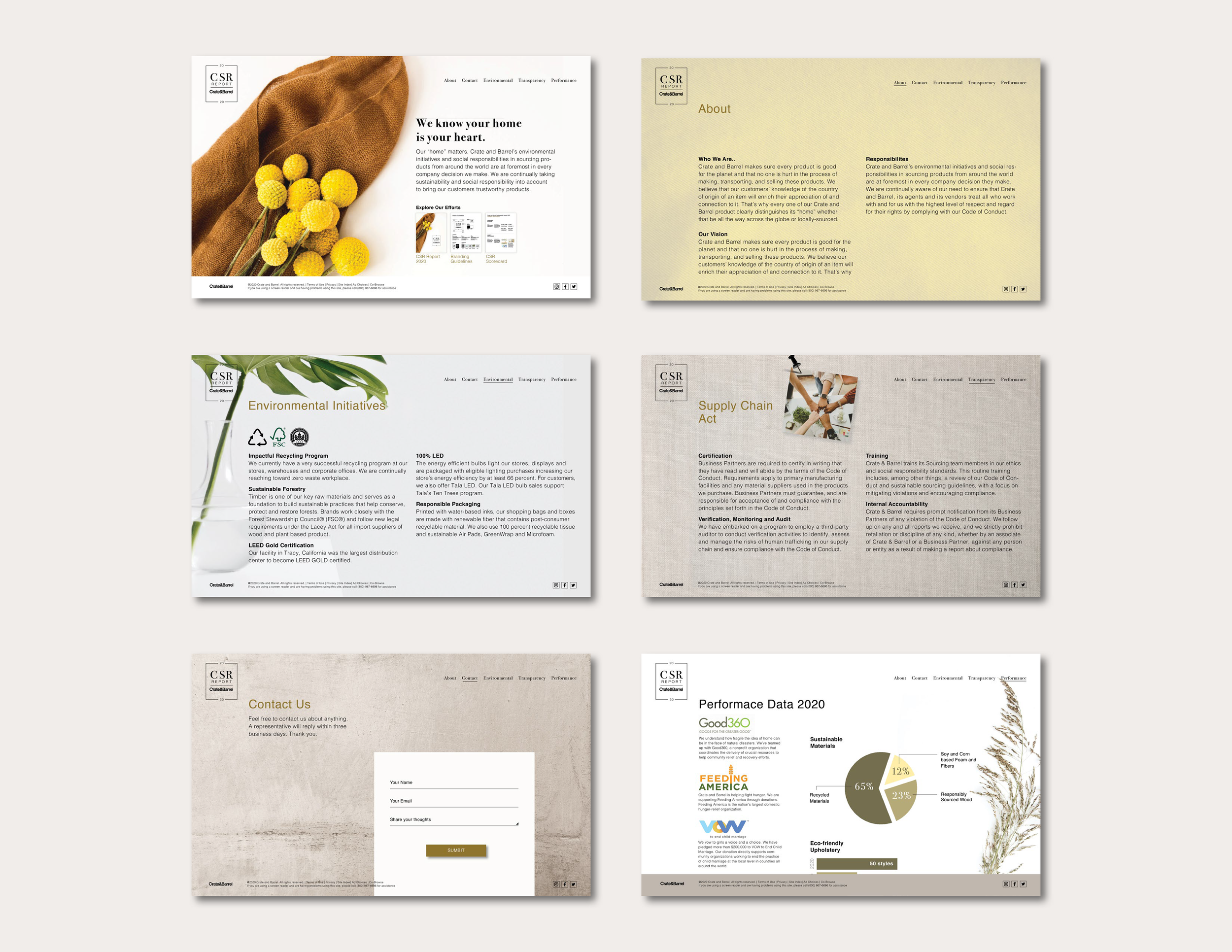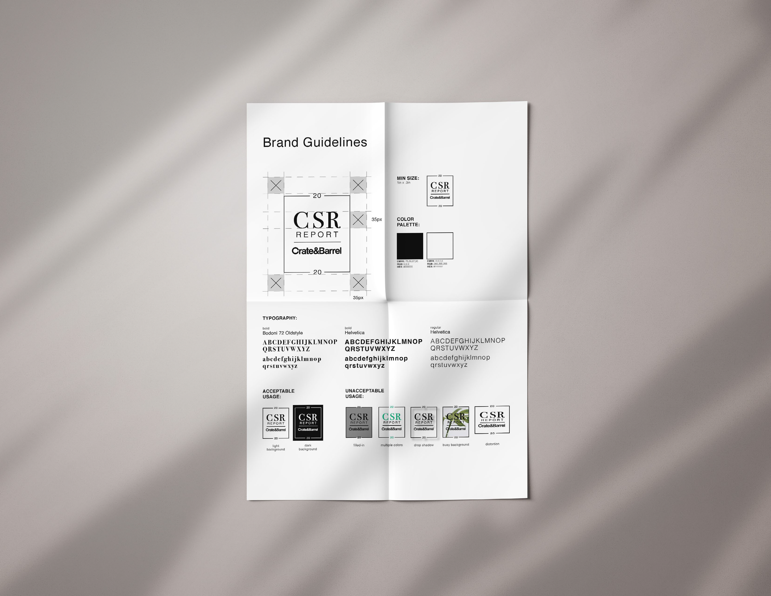 Since a CSR project is about sustainability, choosing earthy tones and textures with simple layouts compliments the already established minimalist Crate&Barrel brand.